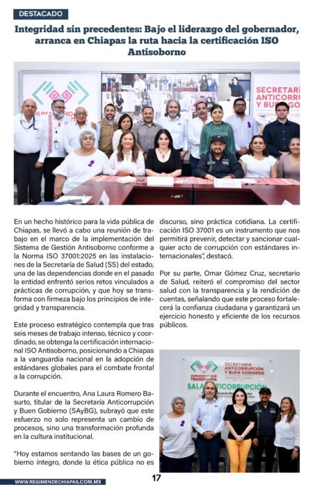 Estado Integridad sin precedentes: Bajo el liderazgo del gobernador, arranca en Chiapas la ruta hacia la certificación ISO Antisoborno