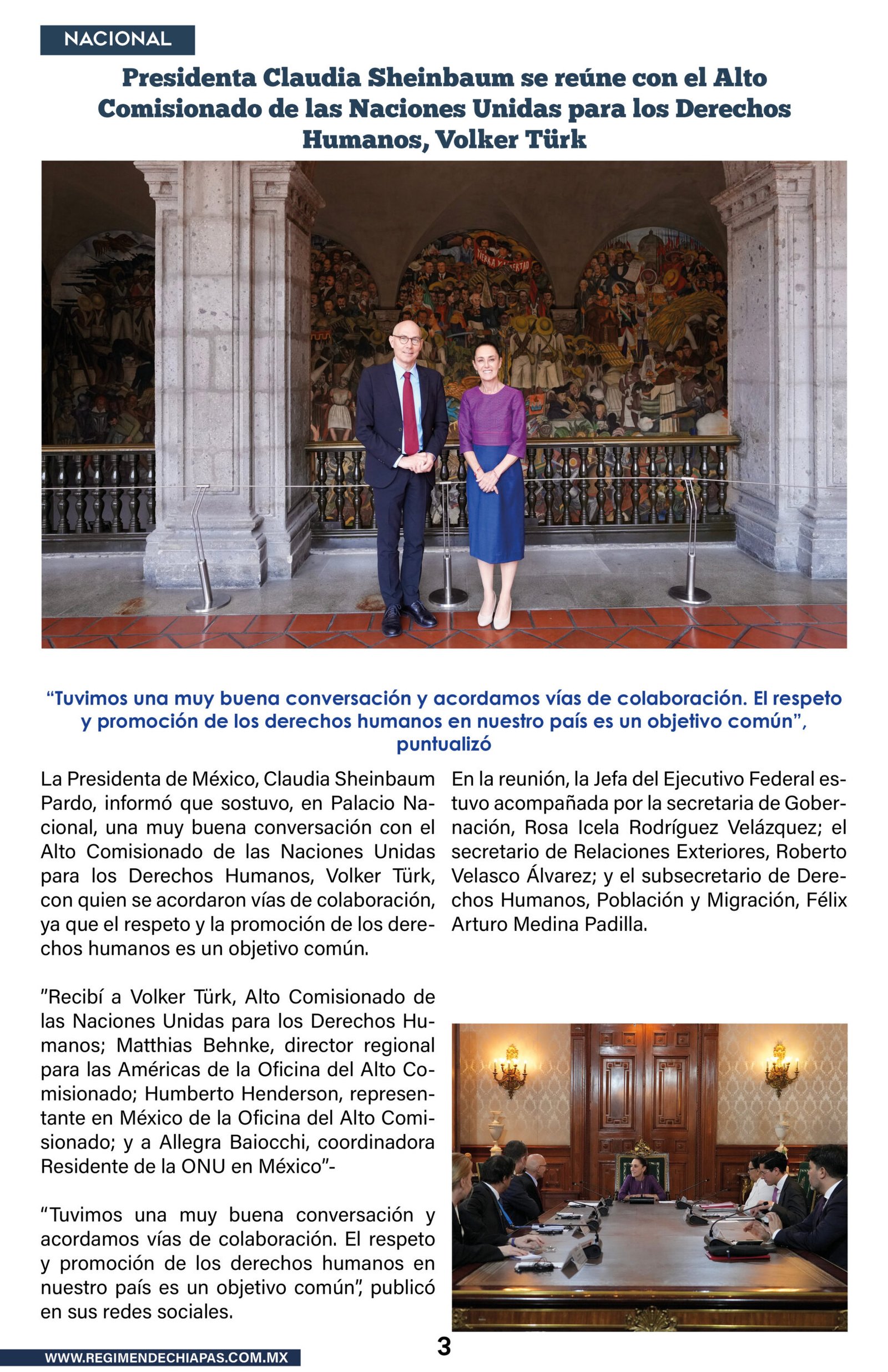 Nacionales Presidenta Claudia Sheinbaum se reúne con el Alto Comisionado de las Naciones Unidas para los Derechos Humanos, Volker Türk