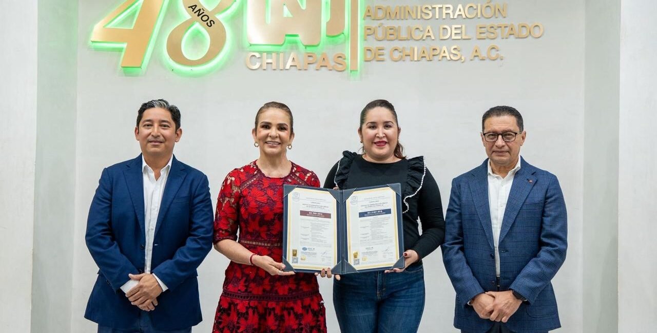 Tuxtla Gutiérrez, Chiapas; lunes 22 de diciembre de 2025.- La presidenta del Instituto de Administración Pública del Estado de Chiapas (IAP Chiapas), Lysette Raquel Lameiro Camacho, recibió dos certificados de gestión de la calidad de manos de Jesús Enrique Zepeda Toledo, director sur-sureste y miembro de la certificadora Educert: Educación Certificada.