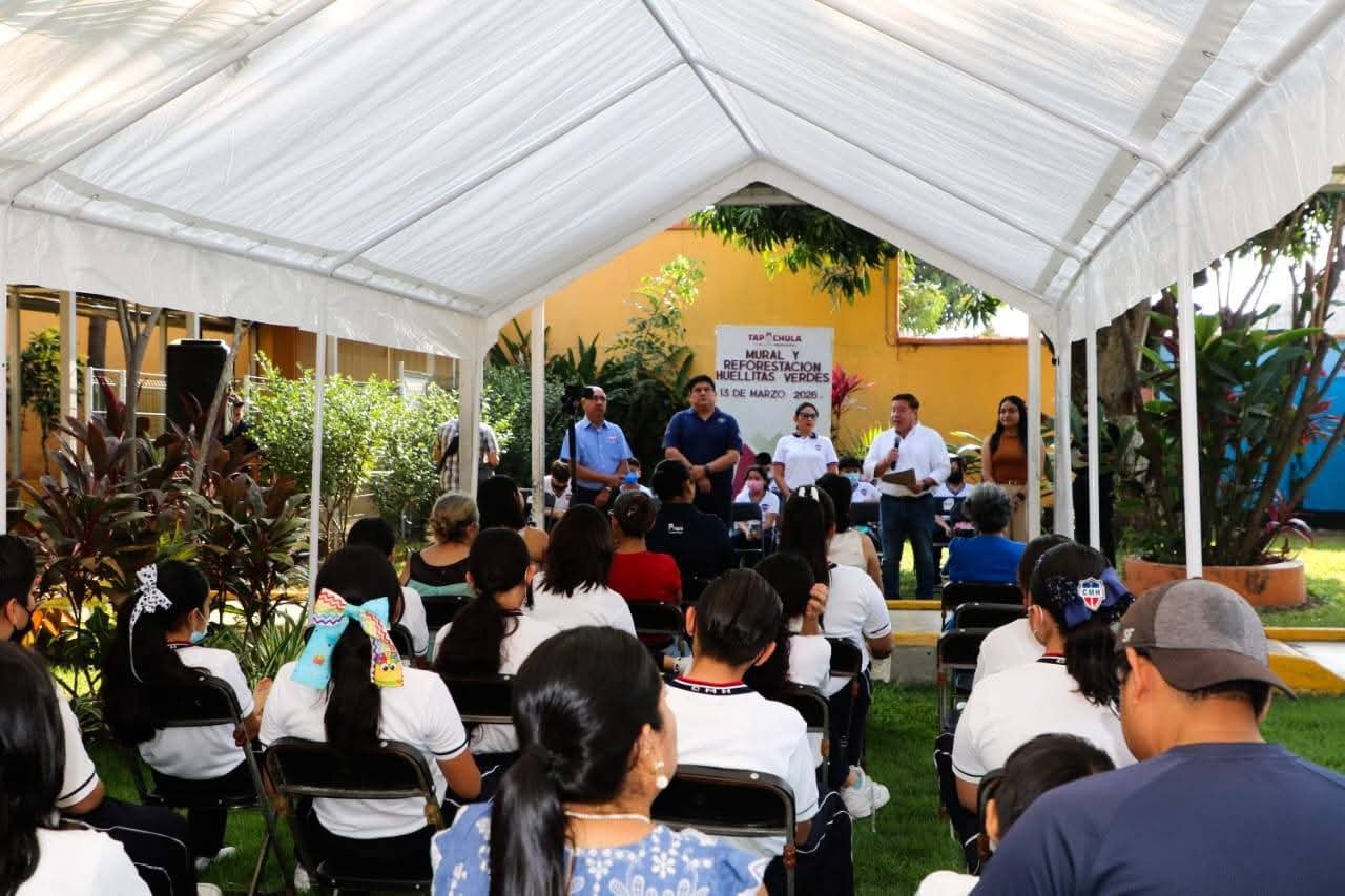 En unidad con la comunidad escolar del Colegio Miguel Hidalgo (CMH), el Ayuntamiento de Tapachula, a través de la Secretaría de Desarrollo Urbano y Ecología (SEDURBE), realizó la develación del mural y acciones de reforestación del proyecto ambiental “Huellitas Verdes”, una iniciativa que busca fortalecer la conciencia ecológica entre las nuevas generaciones.